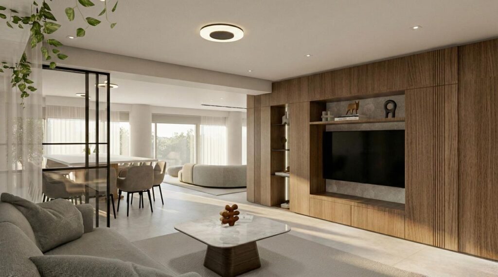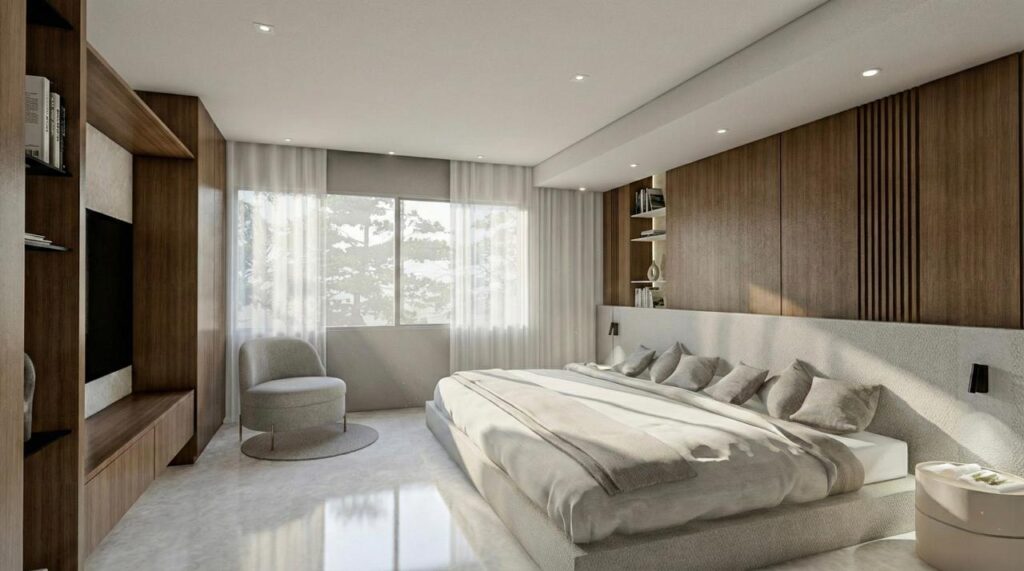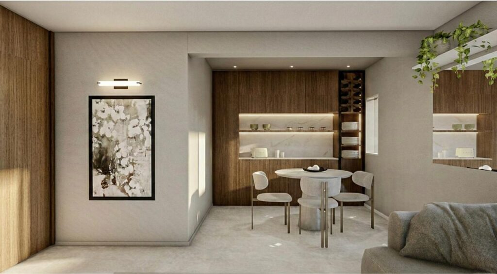 Minimalismo y colores cálidos y claros, mezcla de piedra y madera, con elementos artísticos le darán el marco estético que un departamento de esta categoría requiere.